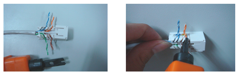 3、以T568B規則為例,首先根據模塊上的圖標,將線與凹槽一一對應。將綠對與橙對的線兩邊分開放入對應的IDC打線端口并拉緊,然后用專用單對端接工具進行壓制。棕對的節距較大,需絞緊一圈,避免頭部線纜扳直后會松開,然后把兩對線按色標放好,再用專用單對端接工具(俗稱打線刀)進行壓制。