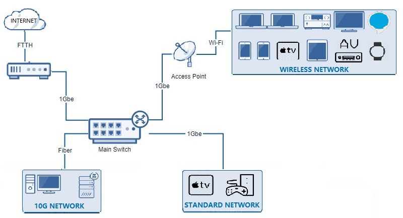 在部署10G家庭光纖網絡之前,最重要的是對您的家庭網絡進行全面的評估,以確保后期部署的網絡可滿足您的所有流量需求。主要就是您的網絡需要連接多少臺計算機、打印機和其他外圍設備?哪些類型的移動設備需要訪問您的網絡?您的無線WiFi需要覆蓋多大范圍?您是否需要監控所有網絡設備?您是否希望網絡設備具備某些特殊功能?您想在哪里建立10G連接?早前的1G連接是否需要保留?