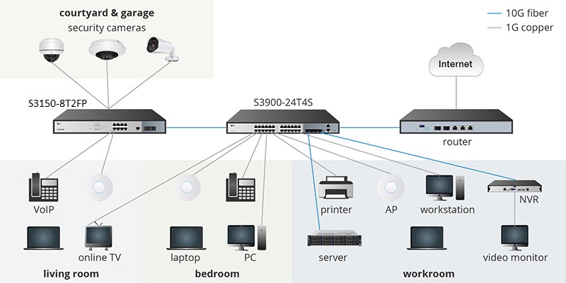 選好網絡設備后,就到了10G家庭光纖網絡部署。典型的10G家庭光纖網絡部署圖如下,整個房子內有很多的網絡設備,在計算好連接線路后,將24端口的萬兆交換機作為家庭網絡中的核心交換機,其中,萬兆交換機的24個電口與大多數的終端設備連接,萬兆交換機的4個SFP+光口與PoE+交換機、路由器、網絡視頻錄像機(NVR)和服務器連接。至于庭院、車庫等中的PoE設備,與8端口的PoE+交換機連接即可。