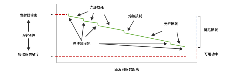 上述提及的鏈路損耗值對整個鏈路的傳輸有何影響?這里就不得不得提到與之密切相關的另外一個參數——功率預算。該參數值主要用于對比計算出的鏈路損耗值,以確保正確安裝設備,只有當鏈路損耗值在功率預算之內時,鏈路才能正常運行。功率預算(PB)是接收器的靈敏度(PR)與發射器耦合進光纖的功率(PT)的差值,也就是說PB=PT-PR。假設發射器的平均光功率為-15dBm,接收器的靈敏度為-28dBm,則功率預算為-15dB-(-28dB)= 13dB。