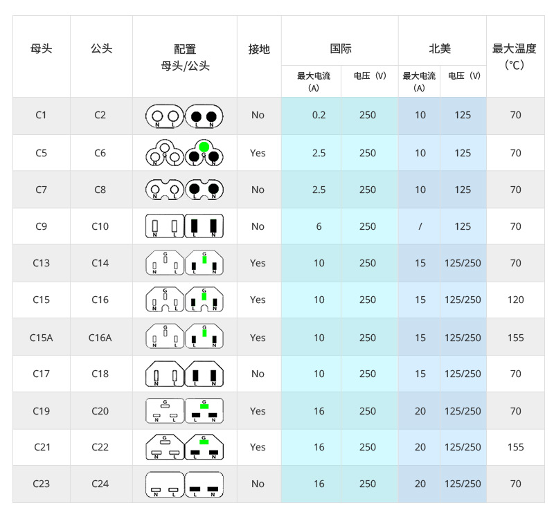 IEC60320電源線顧名思義符合IEC60320標準,這是一款最大電壓為250V的電源線,雖說各個國家都有不同的電源線標準及類型,但是IEC60320標準是大多數(shù)國家使用的國際標準。以下是根據(jù)電流、電壓的不同對連接器進行的分類,其中“C”代表IEC60320制造的連接器代碼標準。