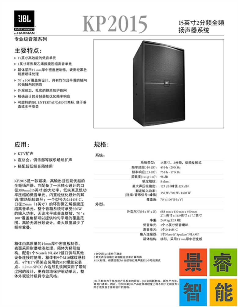 主要特點(diǎn): 15英寸高效能的低音單元 1英寸環(huán)形聚乙烯振膜壓縮高音單元 箱體采用15 mm厚中密度板制作,表面經(jīng)黑色耐磨噴漆處理 70° x 100° 覆蓋角設(shè)計(jì),具有均勻且平滑的軸向和偏軸向的響應(yīng) 外觀前衛(wèi),扎實(shí)的鋼質(zhì)防護(hù)鐵網(wǎng) 精確設(shè)計(jì)的分頻器能優(yōu)化頻率響應(yīng) 可旋轉(zhuǎn)的JBL ENTERTAINMENT 商標(biāo), 便于垂直或水平安裝